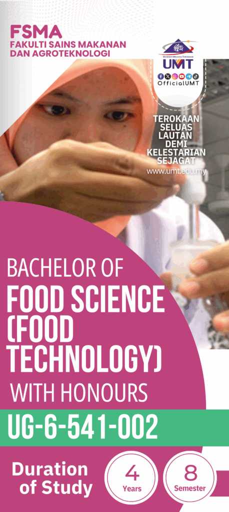 Bachelor of Food Science (Food Technology) was first offered in the Universiti Malaysia Terengganu starting July session 2007/2008. Now it has become one of the most popular programs for students to pursue their first degree. The program aims to produce graduates who are knowledgeable and highly trained and skilled in food processing and production technologies to produce safe and wholesome food. Graduates from this program can work in various public and private agencies in areas related to food science and technology, including research and development of food products, legislation and education. In addition, graduates are also given entrepreneurship knowledge that enables them to be innovative, and independent entrepreneurs in the food industry.